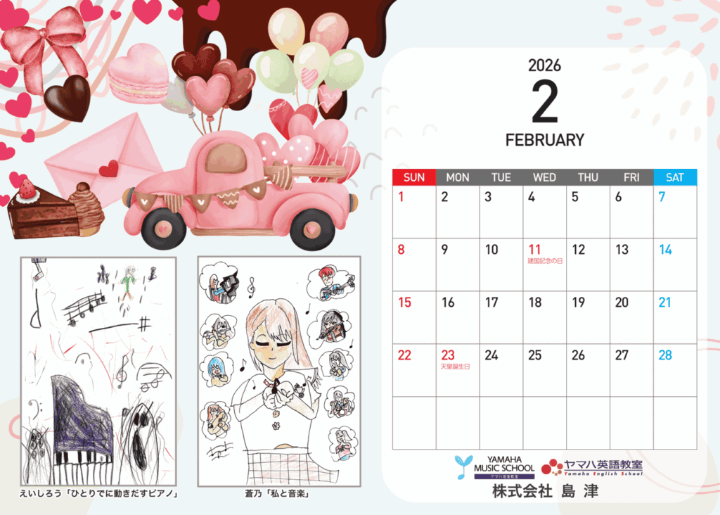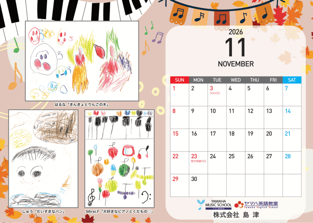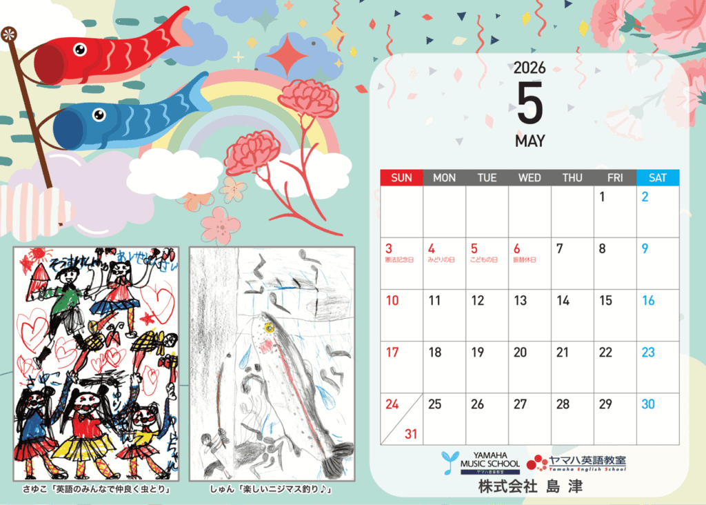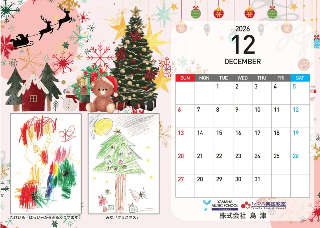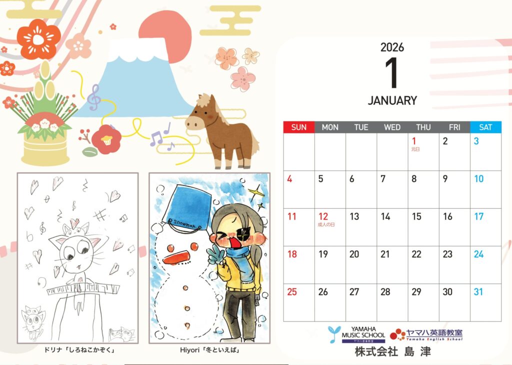 2026年版「島津楽器オリジナルカレンダー」が完成しました。絵をかいてくださった生徒の皆さん、素敵な絵をありがとうございまた。カレンダーはレッスン時に担当講師よりお受け取りください。次回も素敵な絵の応募お待ちしております♪
