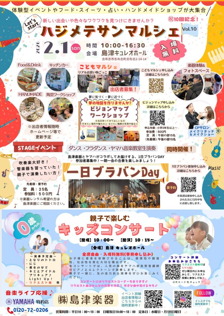 毎年恒例の大人気イベント「ハジメテサンマルシェ」を2/1(日)に開催致します!年の初めに新しいことにチャレンジするきっかけがつまったイベント。楽器体験・陶芸ワークショップ・雑貨販売・フード・絵本の音楽会・一日ブラバン・ステージ発表・・・楽しいイベント盛りだくさん!ぜひご参加ください★